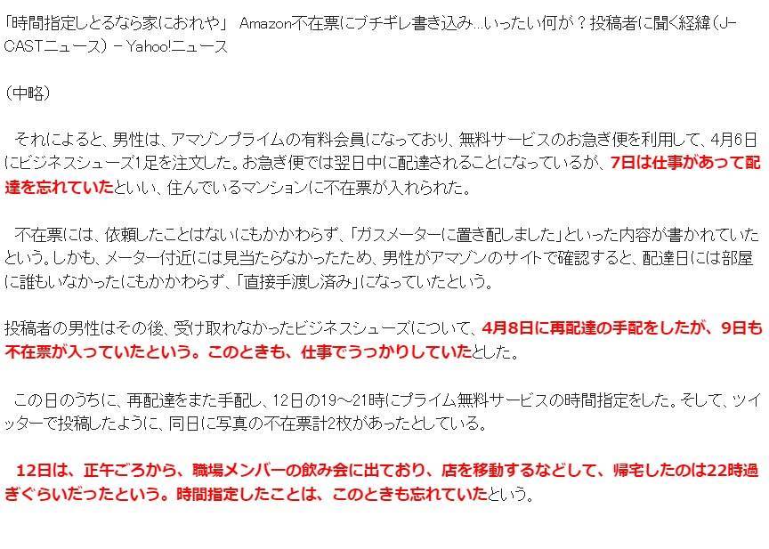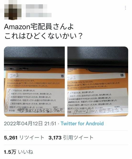 Amazon配達員の暴言不在票を晒した男、実際は3回連続で再配達をすっぽかしていた